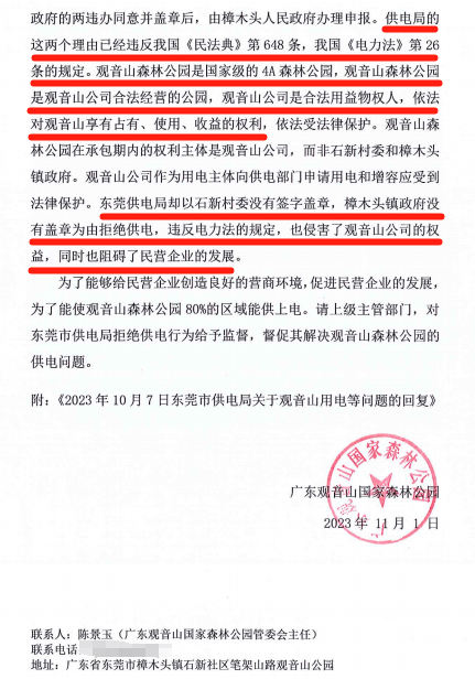 观音山公园认为广东电网有限责任公司东莞供电局虚构事实,因此不服其给予的回复,并于11月1日再次向广东省纪委递交了书面材料《关于东莞供电局2023年10月7日不实回复及推卸责任的情况反映》。