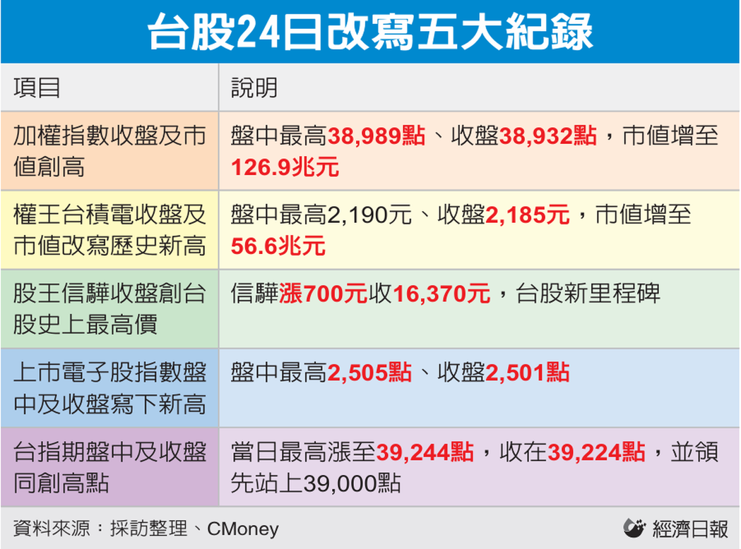 台股昨日写下五大纪录,其一,加权指数盘中最高涨1,275点至38,989点、终场收38,932点,创新高;集中市场市值增3.9兆元至126.9兆元,加计柜买市场后市值攀升至137.3兆元均为历史新高。