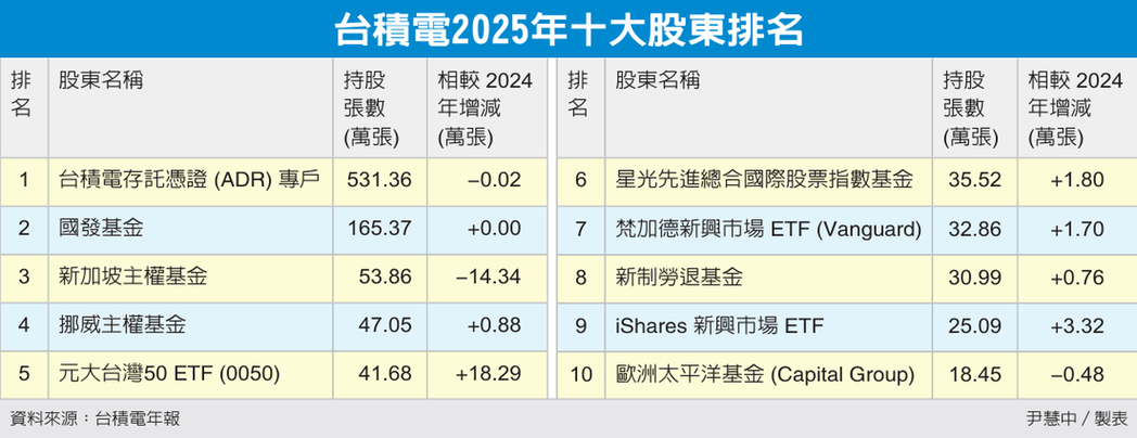 台积电(2330)昨(24)日股价再创新高,收2,185元,上涨105元,依据台积电揭露2025年十大股东结构,元大台湾50 ETF(0050)大举加码逾18万张,一举跃升为第五大股东,是推升台积电市值茁壮最大动能,至于卖股最多的新加坡主权基金则是另一个焦点,近一年减持逾14万张。