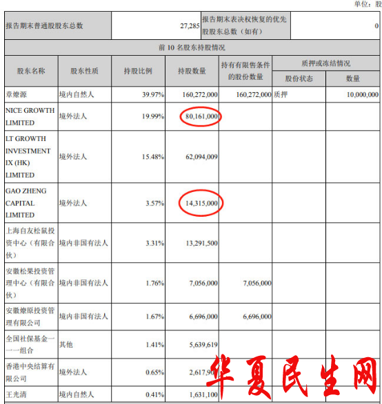 三只松鼠三季报显示,NICE GROWTH LIMITED系境外法人,持有三只松鼠股份数量为8016.10万股,持股比例为19.99%;GAO ZHENG CAPITAL LIMITED系境外法人,持有三只松鼠数量为1431.50万股,持股比例为3.57%;二者分列三只松鼠第2大和第4大股东。