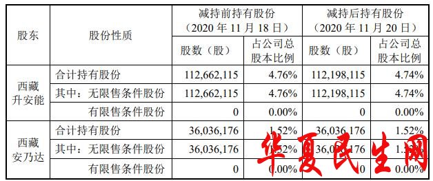由于西藏升安能工作人员疏忽,记错了上述减持计划的期限届满日期,误以为2020年11月19日仍在减持计划期限内。2020年11月19日上午,西藏升安能工作人员通过证券交易系统进行了错误操作,在减持计划期限届满的情况下通过集中竞价交易方式减持了公司股票464000股,占公司总股本的0.02%,交易均价为4.23元/股,成交金额为196.11万元。西藏升安能及其一致行动人西藏安乃达实业有限公司在本次减持前后持有公司股份的情况如下:
