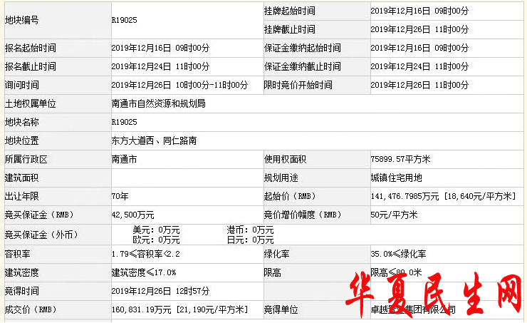 据报道,2019年12月,南通编号为R19025地块出让,历经52轮竞价,最终由卓越集团收入囊中,成交总价16.08亿,成交单价21190元/平方米,溢价率13.68%。