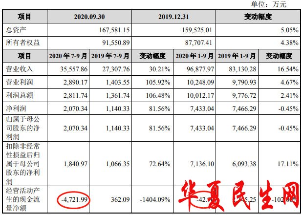 今年前三季度,公司经营净现金流降为负数。2020年1-9月,舒华体育实现营收9.69亿元,同比增长16.54%;归母净利润7433.04万元,同比下降0.45%;扣非净利润7136.10万元,同比增长17.11%;经营活动产生的现金流量净额-42.96万元,同比下降102.00%。第三季度舒华体育经营活动产生的现金流量净额为-4721.99万元。
