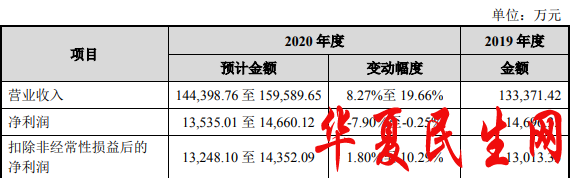 公司预计2020年度营收实现14.44亿元至15.96亿元,变动幅度8.27%至19.66%;净利润1.35亿元至1.47亿元,变动幅度-7.90%至-0.25%;扣非净利润1.32亿元至1.44亿元,变动幅度1.80%至10.29%。