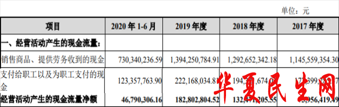 2017年至2020年上半年,公司经营活动产生的现金流量净额分别为7395.64万元、1.32亿元、1.83亿元、4679.03万元;销售商品、提供劳务收到的现金分别为11.46亿元、12.93亿元、13.94亿元、7.30亿元。