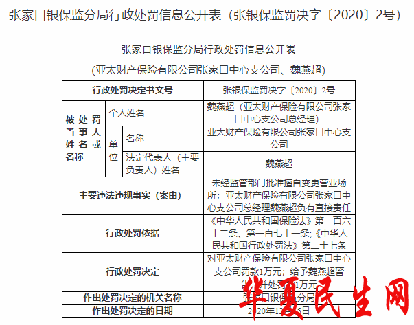此外,亚太财险张家口中心支公司总经理魏燕超对上述违法违规事实负有直接责任。依据《中华人民共和国行政处罚法》第二十七条,张家口银保监分局给予魏燕超警告,并处罚款1万元。