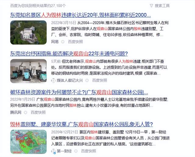 2020年12月,知名媒体第一财经一篇《毁林盖别墅、建豪华坟墓,广东观音山国家森林公园乱象无人管?》报道,曾将观音山公园的毁林违建问题,和相关主管部门东莞市林业局等推上风口浪尖……