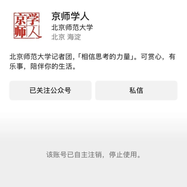 《京师学人》账号显示为“自主注销”,没有对读者说明关闭的原因。