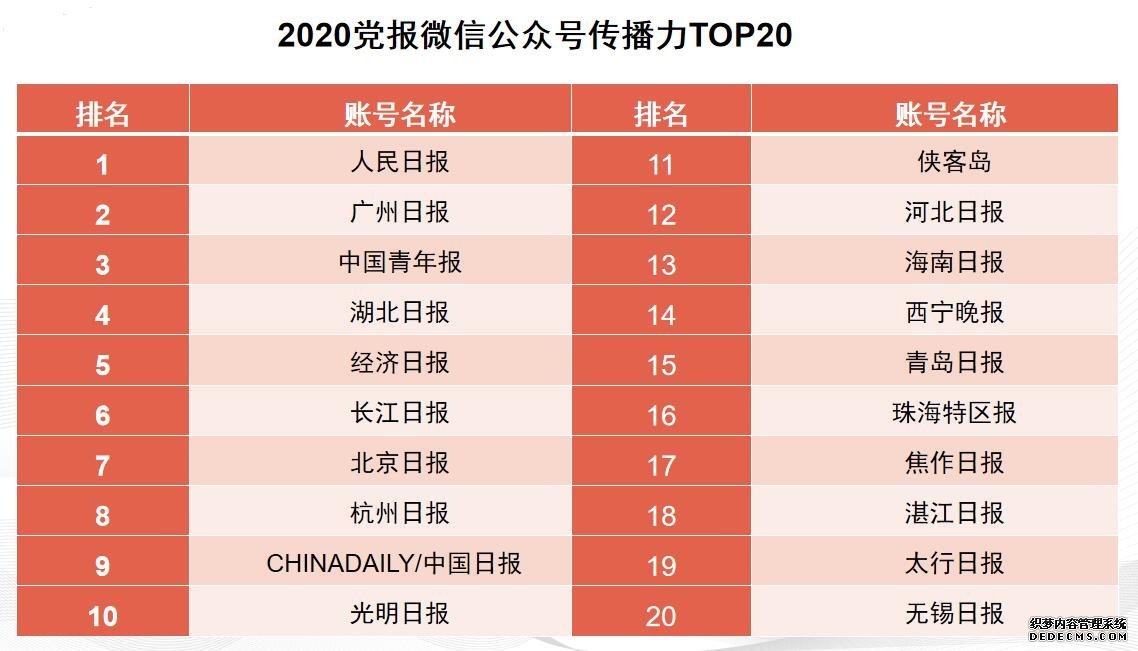 微信传播力前20的微信公众号中,有中央级党报微信6个,省级4个,地市级10个。其中地市级党报微信公众号增加了2个。曾经处于疫情中心区的湖北日报、长江日报的微信公众号进入前十。