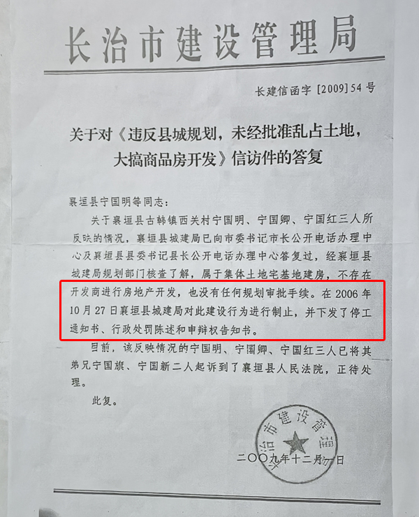 长治市建设管理局2009年12月1日的一份信访件答复显示,12号建筑属于集体土地宅基地建房,不存在开发商进行房地产开发,也没有任何规划审批手续。2006年10月27日,襄垣县城建局对此建设行为进行制止,并下发了停工通知书、行政处罚陈述和申辩权告知书。