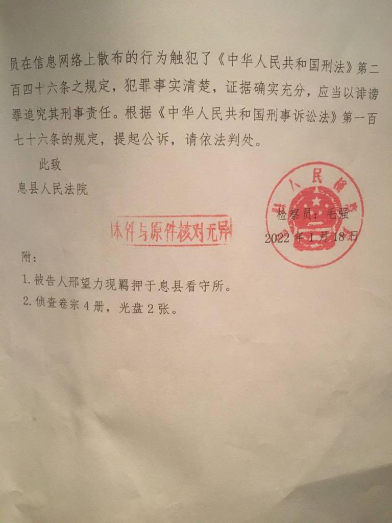 2022年3月21日周一,邢望力之妻徐金翠陪同彭律师前往息县法院,彭律师调取了询问邢望力的同步录像并拿了起诉书;彭律以超过三个月审限向该院提出申请取保候审,但是该院没有回复。