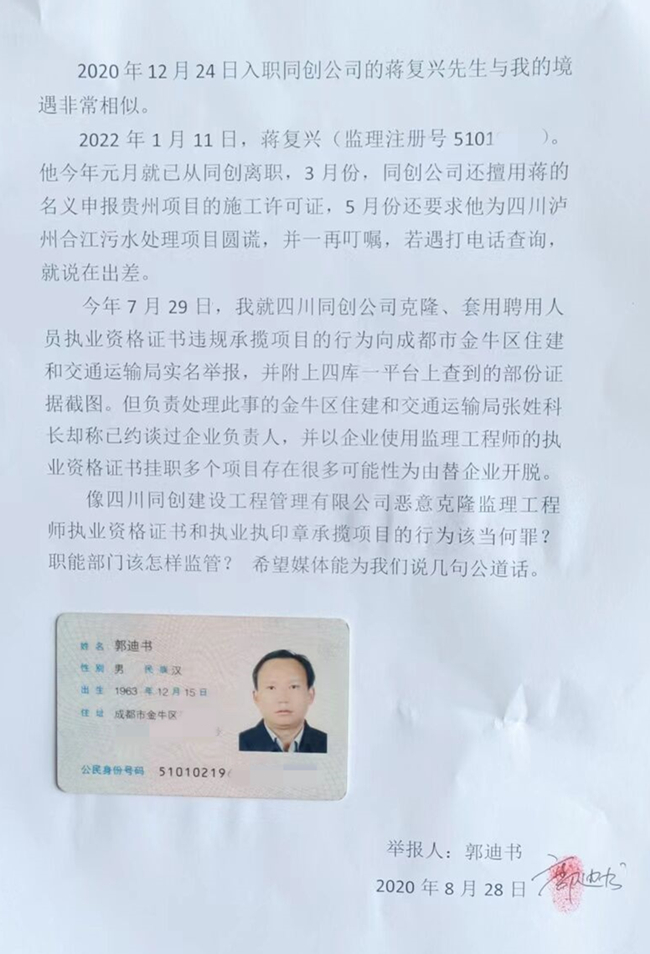 我叫郭迪书,身份证号码5101021963********,是一名监理工程师,执业资格证号5100****。实名举报:四川同创建设工程管理有限公司为牟取私利,恶意克隆监理工程师的执业资格证书,天女散花式地在全国各地投标,该公司在全国所有投标文件罗列的全国注册监理工程师全是挂着几十上百个工程项目的总监或专监,一旦中标签下监理合同就全部换成拿着假身份证的无执业资格证甚至无专业背景的所谓监理人员。本人曾向成都市金牛区住建和交通运输局实名举报,该局回应称:已约谈过该企业负责人,但因企业使用监理工程师的执业资格证书和执业印章挂职多个项目存在很多可能性为由替企业开脱。