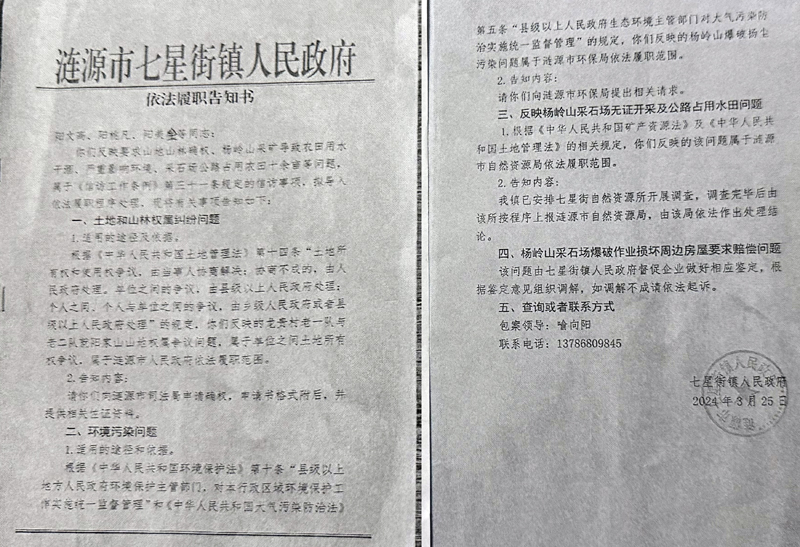 告知反映的杨岭山爆破扬尘污染问题属于涟源市环保局依法履职范围,请向该局提出请求;反映杨岭山采石场无证开采及公路占用永久性水农田20多亩问题属于涟源市自然资源局依法履职范围,镇里已安排自然资源所开展调查,调查完毕后上报涟源市自然资源局依法作出处理结论;杨岭山采石场爆破作业损坏周边房屋要求赔偿问题,镇里督促企业最好相应鉴定,根据鉴定意见组织调解,如调解不成请依法起诉。政府此举明显就是避重就轻,回避事实,这样加剧了事态的严重性。