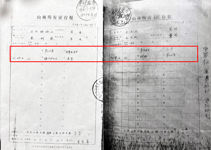 龙贵村老一队群众表示,2024年4月11日,我们的代表在涟源市档案馆找到两份山林所有证的存根,土地权属界限协议书写的清清楚楚。正因为有人伪造改动了山林所有证存根,原老龙踞村(五、九队)依据这一伪造的存根与杨岭山采石场签订土地租赁协议,领取本该属于我们队的土地使用租金。