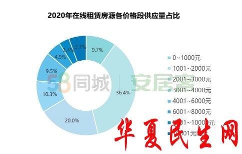 58同城、安居客平台统计数据显示,从全国范围的在线租赁房源供应来看,租金在2000元/月以上的房源供应量占比为53.9%,具体来看,2020年房源的租金价格在1001-2000元/月的占比最高,为36.4%,租金在2001-3000元/月的房源占比两成。