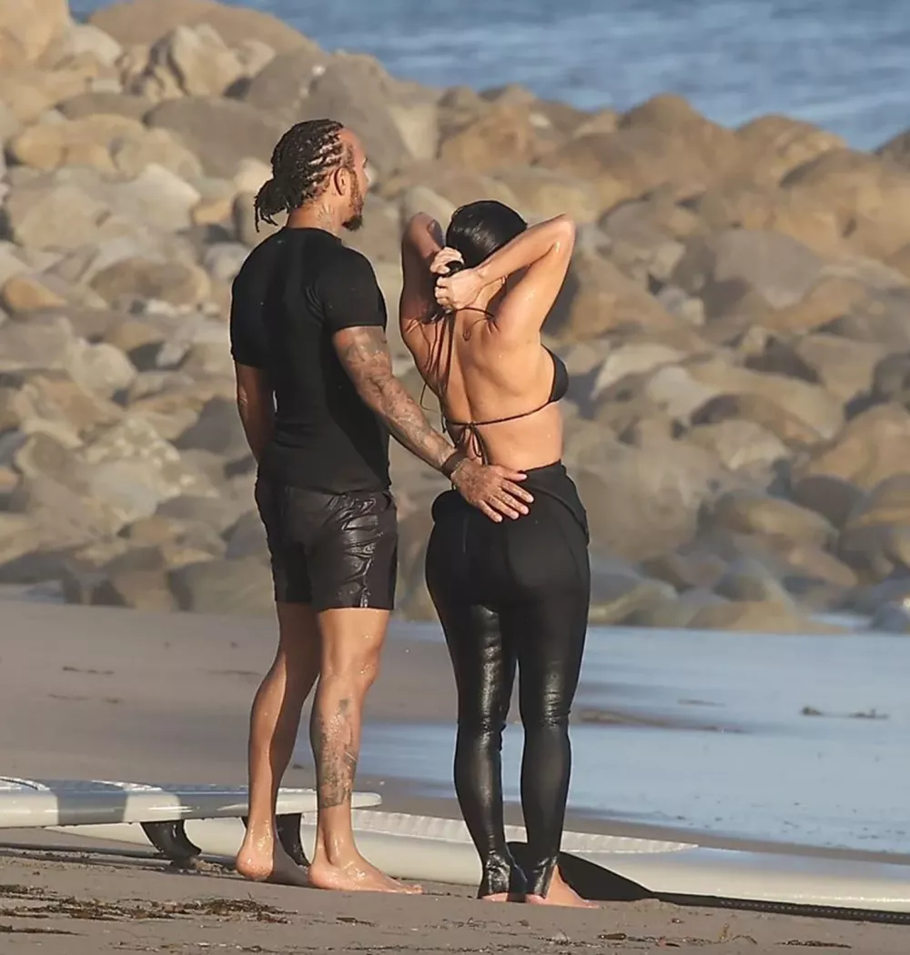 金·卡戴珊与刘易斯·汉密尔顿在加州马里布冲浪时深情拥吻,公开恋情后频繁展示亲密。