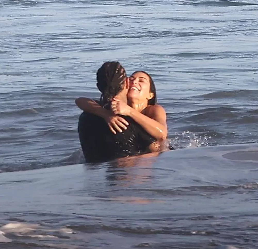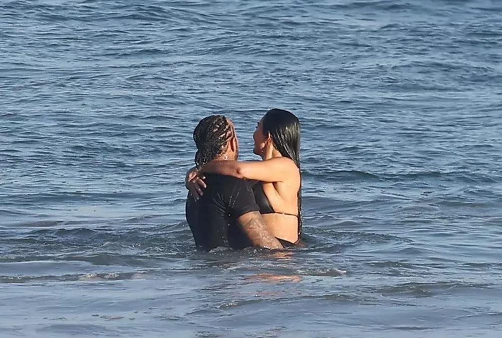 这对情侣全程面带笑容,举止极为亲昵。卡戴珊与汉密尔顿在海滩漫步时有说有笑,频频互动。随后,这对热恋中的伴侣在海浪中相拥戏水。