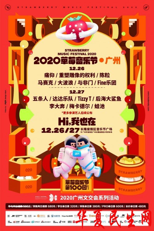 乐迷们翘首以盼的2020年广州草莓音乐节也即将到来:2020年12月26、27日,草莓音乐节将在长隆度假区音乐节广场上演,五条人、痛仰乐队、陈粒、Tizzy T、马赛克乐队、与非门乐队、后海大鲨鱼乐队、李大奔等将在长隆与粉丝们见面。