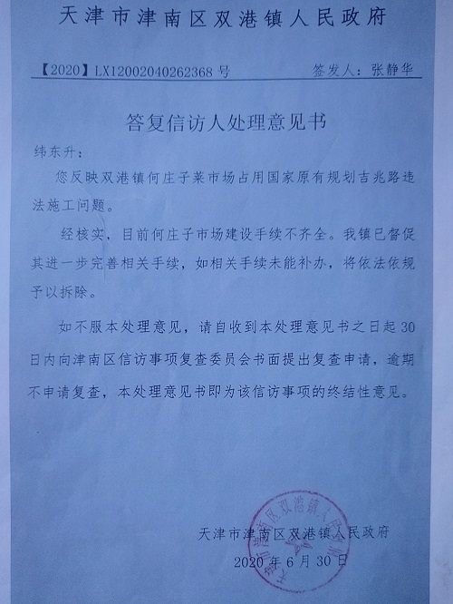 而双港镇政府答复信访人处理意见书明确:何庄子市场建设手续不齐全。我镇已督促其进一步完善手续,如相关手续未能补办,将依法依规予以拆除。