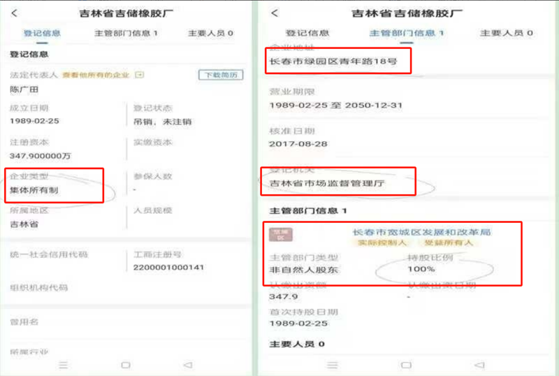 7、吉储橡胶厂现在显示登记机关在省市场监督管理厅、企业住所在绿园区、主管部门在宽城区、所有制形式实为集体企业、却由政府机关 100% 出资、2005年营业执照被吊销,2017年8月营业执照 “起死回生”、企业职工无家可归的 “怪胎企业”,实在是不伦不类,贻笑大方!