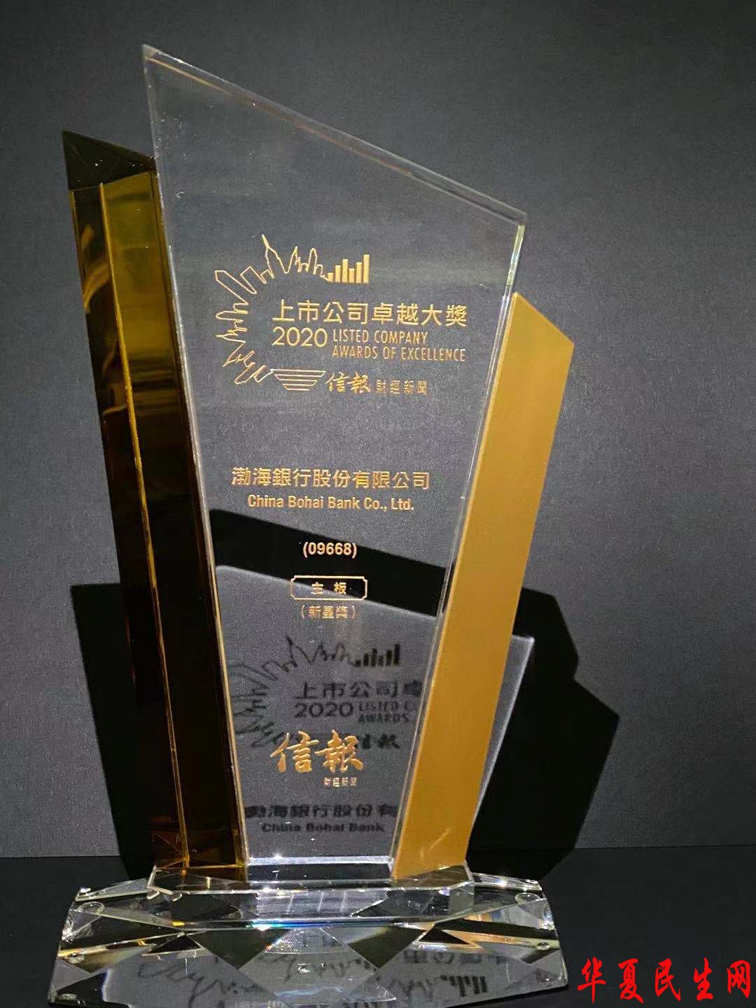 就在《信报财经新闻》刊发专题报道的前一天,渤海银行香港分行在位于国际金融中心二期12楼1201室的总部代表该行接过了印有“上市公司卓越大奖-主板新星奖”字样的沉甸甸的奖杯。这也是渤海银行自今年7月间登陆香港联交所主板市场以来荣膺的首个重量级资本市场奖项(下图)。
