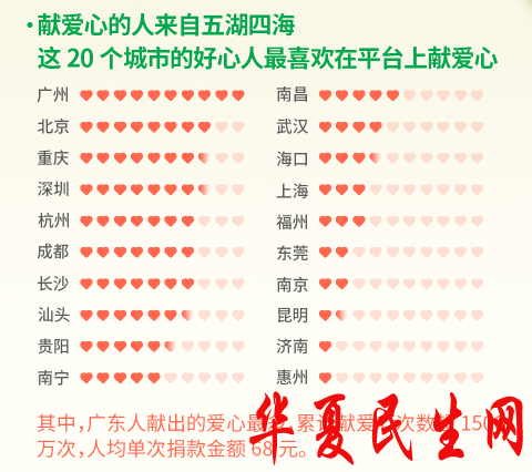过去一年来,360大病筹足迹已经覆盖全国33个省份,爱心参与指数月均增长37%,来自五湖四海的好心人通过平台献爱心。其中,广东、四川、浙江、广西、贵州省爱心参与指数位列前五,广东人献出的爱心最多,累计献爱心次数超过1500万次,人均单次捐款金额68元。