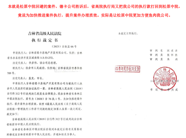 而吉林省高院执行局的做法更绝,在省高院执行局局长李永秋的指使下,该院2023年8月29日竟然做出(2023)吉执监66号执行裁定书,将吉林省高级法院(2019)吉行终312号行政判决交由松原市中级法院执行,把德卡公司的2000多万提存款和案卷全部转给松原市中院。对此,德卡公司感到震惊:此案本身就是异地审理的案件,德卡公司要求异地审理的目的就是让松原中院回避,所以吉林省高院才指定由林区中院审理。现在,由于省高院执行局长李永秋的干预,此案又被打回松原中院去了。德卡公司在林区中院的提存款处于查封期间,居然都能被违规划走.高院执行局则干脆来了个一窝端,在林区中院划走420万元后,又把德卡公司剩余的2000多万元全部转回松原中院!德卡公司认为,这样一来,其为ZF垫付的巨额工程款就更难要回来了。从此,我公司胜诉执行的提存款,就成了他们案板上的唐僧肉,可以由他们随意宰割了。