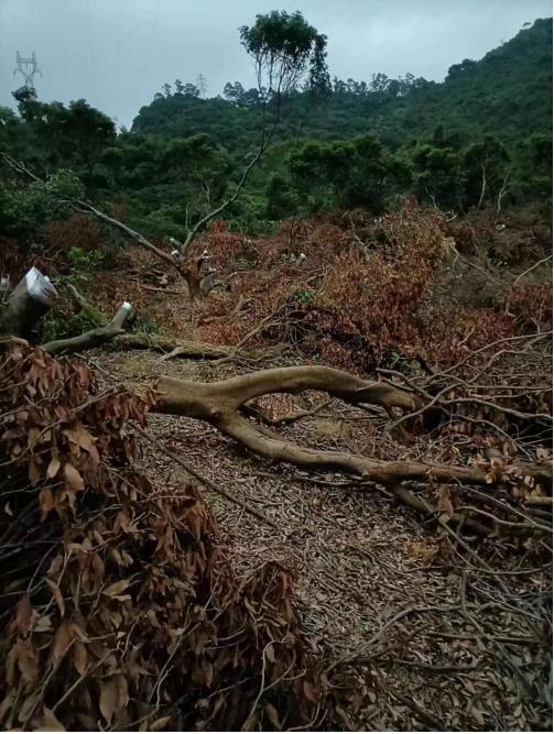 图片说明:村民大面积砍伐荔枝林,枯死的树木与周边形成巨大反差。
