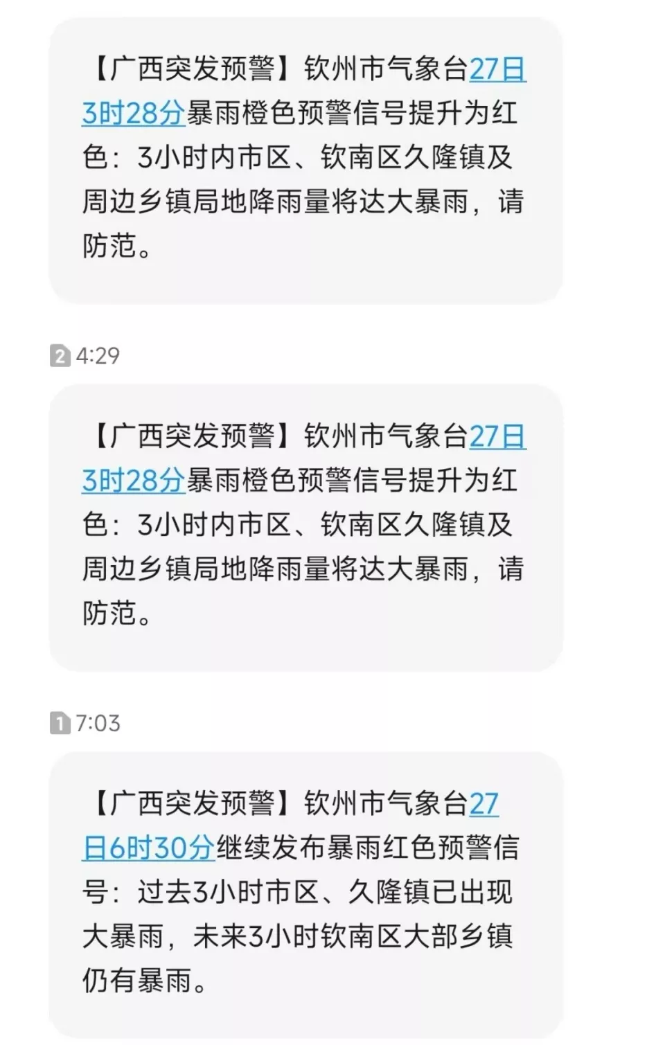 4月27日,华商报大风新闻记者联系钦州市气象台,工作人员称,27日凌晨3时20分发布暴雨红色预警后,于6时30分继续维持最高级别预警。预计今天中午过后降雨会有所减弱。
