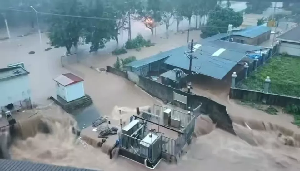 有网友发布的视频显示,钦州某小区门口,积水已没过共享单车的车座,居民只能蹚水出行,部分区域水深在短时间内上涨超过半米。视频中一处广场处,暴雨形成的积水越来越多,最后冲破拦挡物,形成落差水流将一处临建房冲毁。