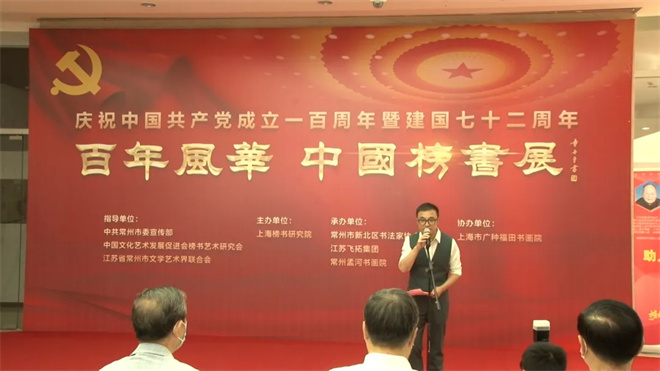 庆祝中国共产党成立100周年 喜迎建国72周年,由上海榜书研究院主办,在常州市市委宣传部、常州市文学艺术界联合会、中国文化艺术发展促进会榜书艺术研究会等部门的指导下、由常州新北区书法家协会、江苏飞拓集团、常州孟河书画院联合承办,上海广种福田书画院协办的《百年风华 中国榜书展》9月28日在常州刘海粟美术馆隆重举行。
