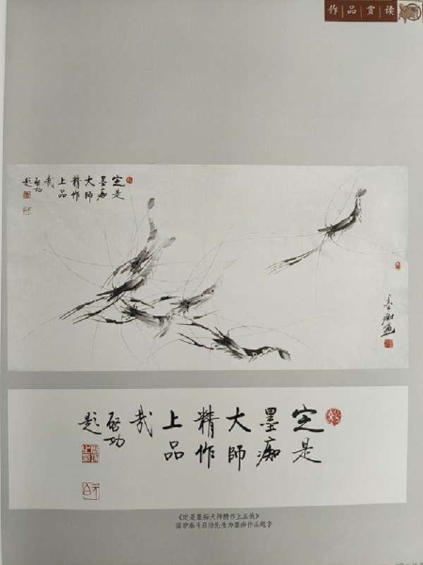 鉴赏大师史树青也亲自为他的《百虾图》题写“墨痴大师百虾图”之字,并又分别为他的两幅画作了题款:“墨痴先生写虾大有白石老人韵致,用墨深浅可分五色,白石不能为也”;“墨痴先生精于大幅,白石老人无此翰墨……”如此赞赏之词实在难以复加。想史老乃当今文物鉴赏泰斗,一代宗师,其中所历古今名家名作无数,而墨痴之作却被史老推崇倍至,对其作品评价之高,在当今画界名流辈出之际,享者鲜有几人