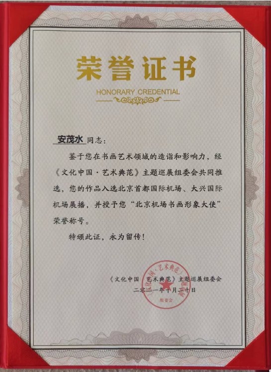 近年来,步入艺术殿堂的安茂水,情难自禁,创作热情高涨,成就斐然,一发不可收,不断有佳作问世。在篆刻、书法、绘画等艺术领域,博采众长,自成一家,形成了独特的艺术风格,取得了令人称叹的成绩。参展作品多次摘得金奖、大奖。有的作品被国际友人和博物馆收藏。