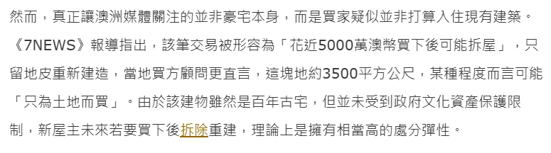 澳洲媒体还指出,周杰伦没有马上入住的打算,计划只保留地皮,整栋豪宅都要拆掉重建,因为该豪宅不受文化资产保护,屋主想拆掉的话没有什么阻力。