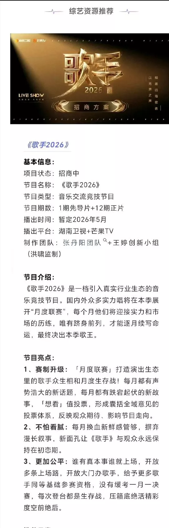 如果说内娱还有哪个综艺能让网友集体“仰卧起坐”,那必须是《歌手》。苦苦等待的《歌手2026》终于正式官宣定档了!先导片将于5月16日亮相,5月22日起每周五晚七点半,湖南卫视和芒果TV将同步开启这场音乐盛宴。