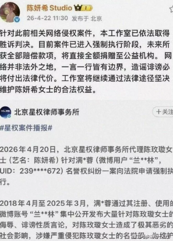 2026年4月20日,陈妍希的律师向法院提交了强制执行申请。四天后,陈妍希工作室发文回应。声明里说,案件已进入强制执行阶段,未来所获全部赔偿款项,将直接全额捐赠至公益机构。