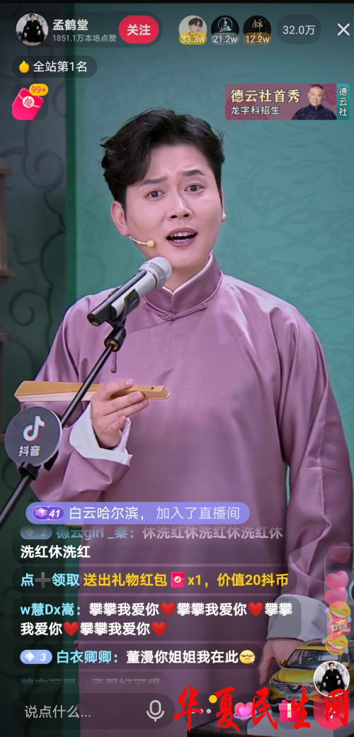 12月23日晚7点,德云社鹤字科演员孟鹤堂抖音直播专场如期而至,十年搭档周九良及龙字科招生特别指导栾云平等多位相声演员现场助阵,在德云社龙字科招生即将开始之际,为观众带来传统曲艺、流行舞蹈和描眉画像等多种才艺技能展示。