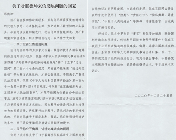 主审法官孙国彬拿出的假出入境记录被曝光后,激怒了朝阳区法院一部分人,于是,原告便见不到主审法官孙国彬了,说是到北京出差了,可是这一出差就是20多天,相当一段时间原告是投诉无门,上访无路,无奈只能写信给院长。2021年1月11日,原告得到了主管副院长包晓勇的通知说:多次来信院长已收到,并给了答复,回复信已送到经办该案的桂林法庭。作为该案的原告能得到院长的亲自回信,说明所有的努力没有白费,是件值得高兴的事。可是,当原告在桂林法庭拿到院长的回信时,却让人感到十分茫然,奇怪的是院长的回信,既没有署名、签字,也没有盖章,落款的时间还是15天前的(即2020年12月25日),这算什么回复信呀?当原告向桂林法庭王文涛庭长求证,这是否是于茗辉院长给原告的回复信?为何没有署名或盖章?王文涛庭长说这就是院长给你的回复信(原告在与包晓勇副院长通电话时也证实了这一点)。王文涛还说这封信不能署名,更不能盖章了。原告问为什么?那这算什么回复信呢?多亏是在法庭办公场所得到的,否则,在外面别人可能认为原告自己做的或从垃圾堆里拣来的呢(附回复信影印件)。过后,原告仔细认真琢磨这封信及内容,发现该信除院长本人不敢担当不敢署名的可能性外,还有一种可能就是该信就不是院长本人所为,是副院长包晓勇等人假借院长之名,利用回信之机对原告发出警告且不敢留下自己的名字。时间落在2020年12月25日,其目的是规避民法典及新婚姻法生效之日,以防时间上出现法律瑕疵。因此,本人认为这封信其真正意义是封“官方无名警告信”。因为他们内心有鬼,做了错事还不敢担当,想警告原告不要再曝光了,又怕负法律责任。这就是朝阳区法院从上至下相互勾结,袒护被告而继续拖延案件审理、变相报复原告,而上演的一出“闹剧”。