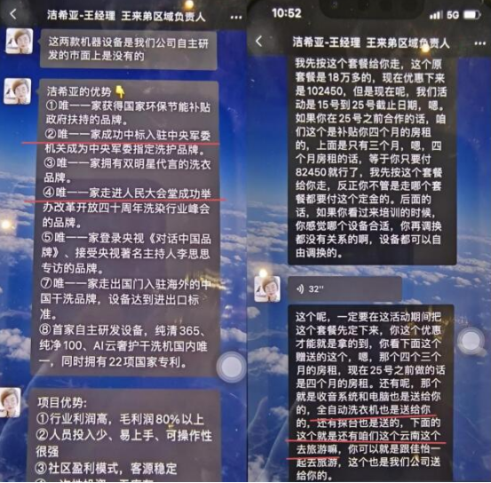 我的干洗店开业以后经营很难,他们前面所说的一系列扶持全是空谈,一样也没有兑现。我试图联系北京洁希亚老板陈友兵,我给他打电话他不接,我给他发信息也不回。我想让他帮助我们扶持我们,洁希亚的老板信息不回电话也不接,他们全部不理人,我们老百姓没有可讲理的地方!他们一环一环的各种套路骗人。