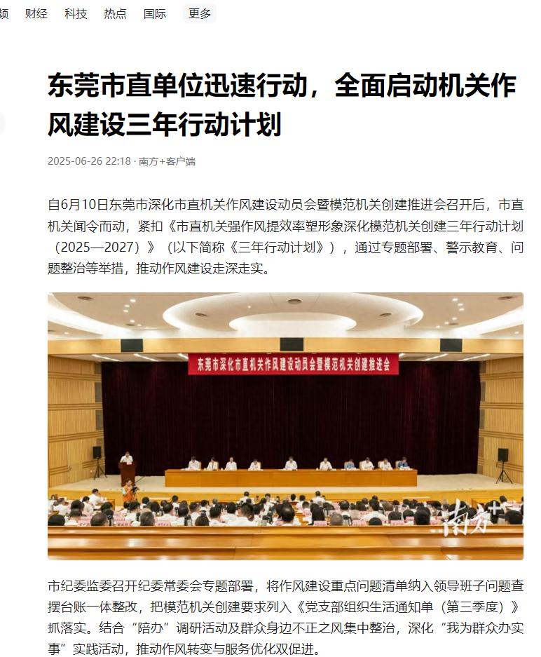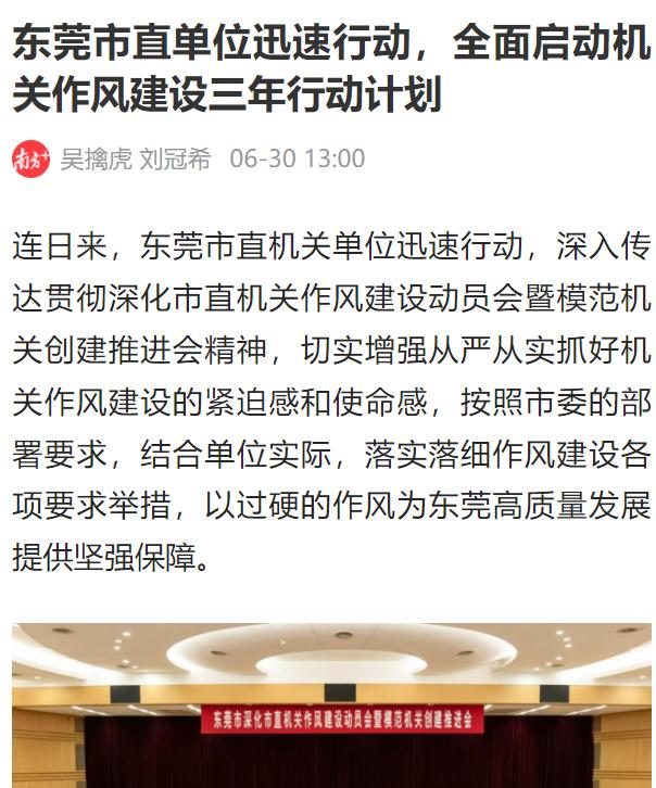 6月26日,南方+发布《东莞市直单位迅速行动,全面启动机关作风建设三年行动计划》,报道称自6月10日东莞市深化市直机关作风建设动员会暨模范机关创建推进会召开后,市直机关闻令而动,紧扣《市直机关强作风提效率塑形象深化模范机关创建三年行动计划(2025—2027)》(以下简称《三年行动计划》),通过专题部署、警示教育、问题整治等俅耄贫鞣缃ㄉ枳呱钭呤怠�