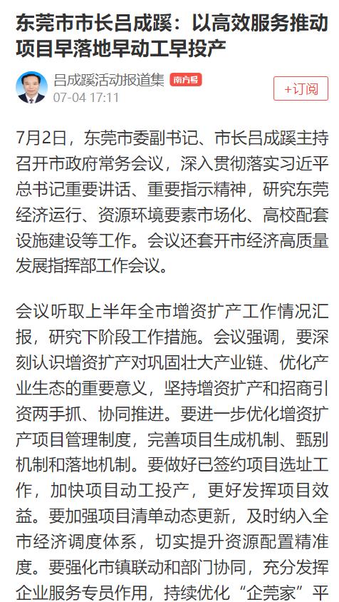7月4日,南方+报道了《东莞市市长吕成蹊:以高效服务推动项目早落地早动工早投产》;7月2日,东莞市委副书记、市长吕成蹊主持召开市政府常务会议,研究东莞经济运行、资源环境要素市场化、高校配套设施建设等工作。