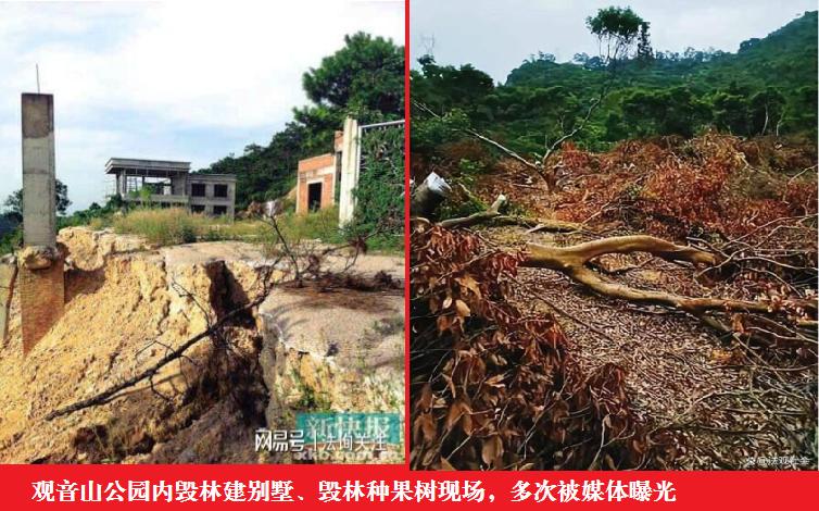 这些情景,可以参考媒体报道的:《国家4A级森林公园竟藏22栋私人别墅》、《20余年间 广东观音山国家森林公园约2000亩生态林被毁 如何破解?》、《4A景区被”毁容” 观音山森林公园遭毁林破坏生态》、《植树节前夕观音山再现毁林乱象,东莞生态保护环境亟待重塑!》、《广东观音山国家森林公园毁林种果为何屡禁不止?》、《从“两高”发布生态环保检察公益诉讼看观音山千亩毁林能否被查》、《观音山国家森林公园二十年被毁林近二千余亩 林长是何表态》、《国家多部门合力守护林草资源,观音山原始次森林被破坏该有人管了》、《观音山国家森林公园毁林、修编真相揭秘》、《盘踞广东观音山国家森林公园违建缘何成“不倒翁”》、《从东莞观音山违建别墅看当地营商环境的现实与隐忧》、《广东深化林长制改革,东莞观音山毁林违建问题能否迎来“终结篇”?》、《评:东莞观音山森林公园毁林现象屡禁不止,谁之责?》、《东莞构建全方位控违治违体系 观音山大量违建无人理》......