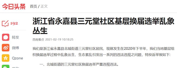 我们是浙江省永嘉县北城街道三元堂社区居民,现就发生在2020年下半年,我们当地基层组织换届选举过程中乱象丛生、政治生态紊乱引发出一系列的违法违规之问题,特投诉举报如下: