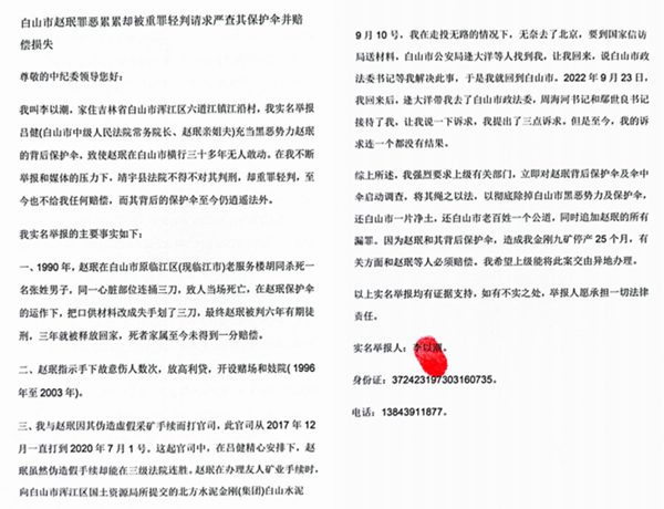 综上所述,我强烈要求上级有关部门,立即对赵珉背后保护伞及伞中伞启动调查,将其绳之以法,以彻底除掉白山市黑恶势力及保护伞,还白山市一片净土,还白山市老百姓一个公道,同时追加赵珉的所有漏罪。因为赵珉和其背后保护伞,造成我金刚九矿停产25个月,有关方面和赵珉等人必须赔偿。我希望上级能将此案交由异地办理。