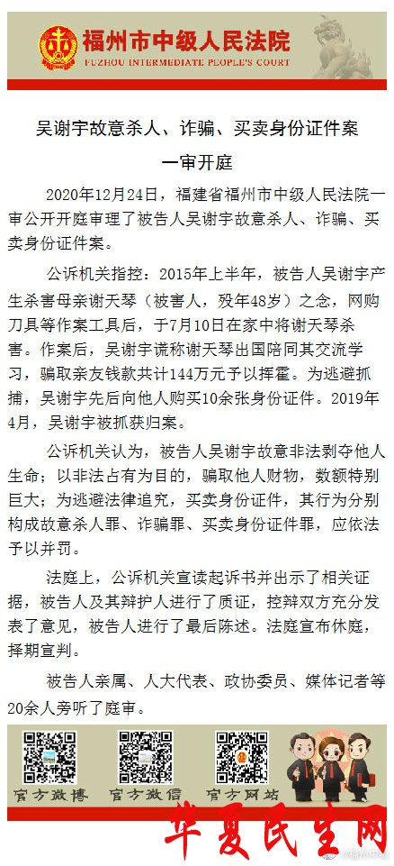 中国网12月24日讯 据福建省福州市中级人民法院官方微博消息,2020年12月24日,福建省福州市中级人民法院一审公开开庭审理了被告人吴谢宇故意杀人、诈骗、买卖身份证件案。