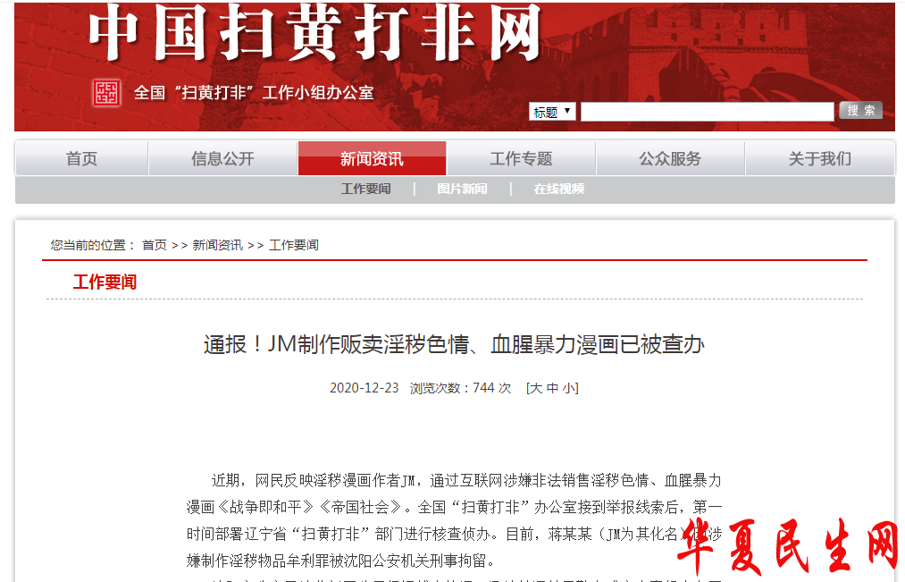 中国网12月24日讯 全国“扫黄打非”工作小组办公室官网昨日(23日)通报,根据网民反映淫秽漫画作者JM,通过互联网涉嫌非法销售淫秽色情、血腥暴力漫画《战争即和平》《帝国社会》。全国“扫黄打非”办公室接到举报线索后,第一时间部署辽宁省“扫黄打非”部门进行核查侦办。目前,蒋某某(JM为其化名)因涉嫌制作淫秽物品牟利罪被沈阳公安机关刑事拘留。