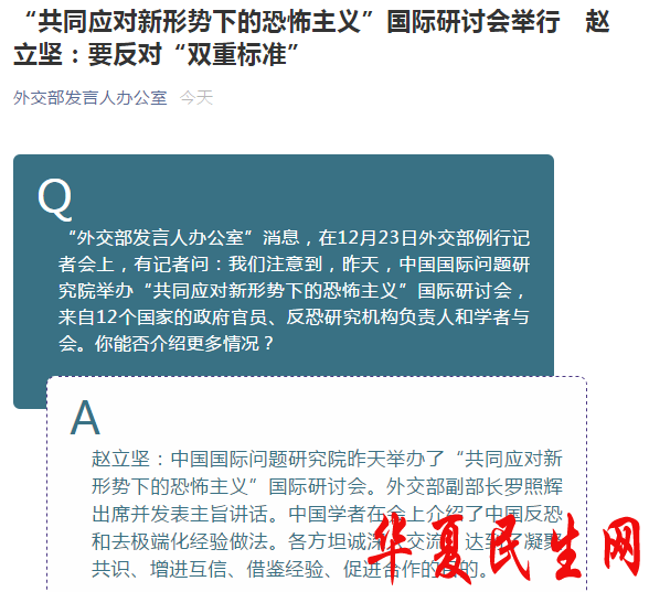 “共同应对新形势下的恐怖主义”国际研讨会举行 外交部:要反对“双重标准”